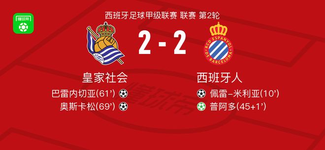 8月25日,北京时代,在西班牙第二个足球联赛中,真正的社会在家对阵西班牙的比赛。在游戏中,西班牙人标志着罗伯托·费尔南德斯(Roberto Fernandez)帮助佩雷·米利亚(Pere Milia)的第一笔记。在上半场,普多多(Puado)进行了惩罚以扩大比分。改变了双方后,真正的社会通过Barenicea赢得了一场比赛。然后,奥亚萨瓦尔(Oyasaval)和奥斯卡森(Oscarson)提供了帮助,并取得了另一个进球,以帮助真正的社会领带。最后一场比赛结束了,真正的Sociedad以西班牙语为2-2。在激动时刻的第10分钟,西班牙球员罗伯托·费尔南德斯(Roberto Fernandez)帮助佩雷·米利亚(Pere Milia)进球。在停止上半场的第一分钟,西班牙球员普拉多获得了点球。在-61分钟内,Real Sociedad球员Barrenecea攻入了进球。在第69分钟,Real Sociedad球员Oyasawar帮助Oscarson得分。团队阵容技术统计