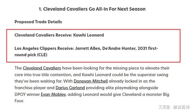 也许没有人认为自从伦纳德加入快船队以来的过去六年中,他没有重新进入决赛,只是让球队赢得冠军。尽管快船管理人员对他保持了高度的信任,但今年夏天的阴阳合同事件暴露了,该合同已重新定位了快船队和伦纳德(Leonard)。因此,媒体FW只是要求快船队在这个关键时刻交易伦纳德,而东方的骑士可能是一个好伙伴。一方面,双方都处于不同的部门,而快船没有直接投资于敌人。此外,骑士在东方,也是潜在的冠军队。自然,他们会考虑介绍伦纳德(Leonard),以增加赢得冠军的希望。从特定的计划中,梅·帕克里普斯(May Pclippers)与两名主要骑士球员贾雷特·艾伦(Jaret Allen)和迪安德雷·亨特(Deandre Hunter)以及2031年首轮选秀权发生冲突。如果伦纳德今天可以交换这么多所有者,快船肯定会满意。我们都知道,伦纳德仍然是卫生联盟的主要超级巨星,但是这种情况很难满足。自从伦纳德(Leonard)加入快船队以来,有两个地块,要么伦纳德(Leonard)在常规时期有一个完整的火力,要么起初,因此由于损害损失,他可能会提早付款。或像上个赛季一样,快船对伦纳德的保护是一本书的简单水平,他在第一个季后赛中击败了四个球,但是快船队仍然失去了掘金,并检查了他的队友。骑士队可能是当今联盟中最合适的球队之一,尤其是东部会议的比赛有限,伦纳德只能在常规赛中直接躺在比赛中。但是近年来很难描述骑士在高端游戏中的表现。猛龙队的成功经历可以与骑士战斗,并在此时追求伦纳德。快船c他们的思想悬而未决,并承认他们未能与伦纳德(Leonard)成为主要的团队。但是,在阵容的当前深度上,即使快船没有莱昂德,也不应将其力量估计。如果引入了Jaret Allen,快船的内部将有所改善。由于洛佩兹(Lopez)很老,因此他无法期待很长一段时间。 Jarret Allen完全不同。他完成了Zubac,而快船的内部将是一个真正的无飞行区。亨特(Hunter)是伦纳德(Leonard)的低版本,而坎桑(Kanyang)的受欢迎程度和力量肯定会更糟。但是亨特也具有相同的技能和规模,如果作为首发或替代者,他可以表现稳定,更不用说他年轻了。至于未来的第一轮选秀权,这意味着即使快船将来重建,他们也将拥有更多的团队建设所有权。