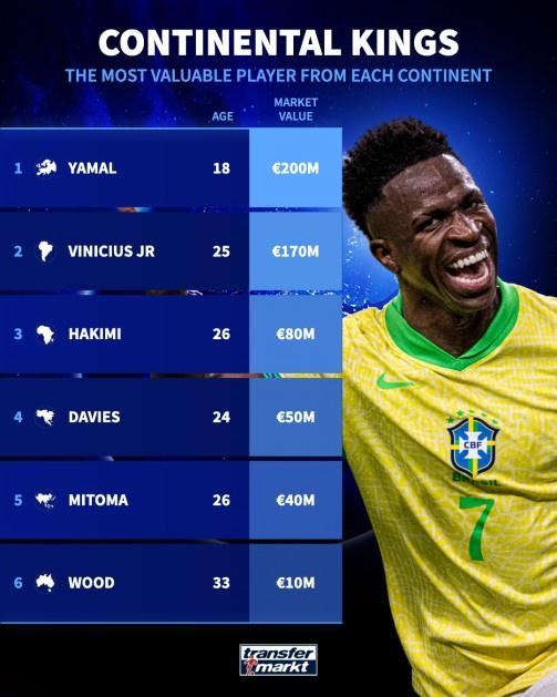 8月23日,德国转会市场的直播列出了每个大陆上最重要的球员以及每个大陆的球员总成本。各大洲的球员最高价值:欧洲 - 雅马尔(18岁) - 2亿欧洲和南美 - 维尼西乌斯(25岁) - 1.7亿欧洲和非洲非洲 - 阿什拉夫(26岁) - 8000万欧洲和北美 - 戴维斯 - 戴维斯(24岁) - 5000万欧洲和亚洲和亚洲 - 亚洲 - 亚洲 - 欧洲和亚洲-Sanzao -Sanzao -4000万年 - 3年(3年)(3年(3年3月3日)(3年3月3日(3年3月3日)(3(3)(33年3月3日(3年3月3日)(3(33年3月3日)(3年3月3日(3年3月3日)(33年3月3日(3年3月3日)(33年3月3日(3年3月3日)(3年3月3日(3年3月3日) (33岁(33岁(33岁)-1000万欧洲和大洋洲-1000万欧洲和大洋洲-1000万欧洲和大洋洲(12,111)---64.1亿欧洲和亚洲(12,999人) - 26.8亿欧洲和北部的美国和北部美国(4,253人)(4,253人)-246亿欧洲和大洋洲(1,382人)